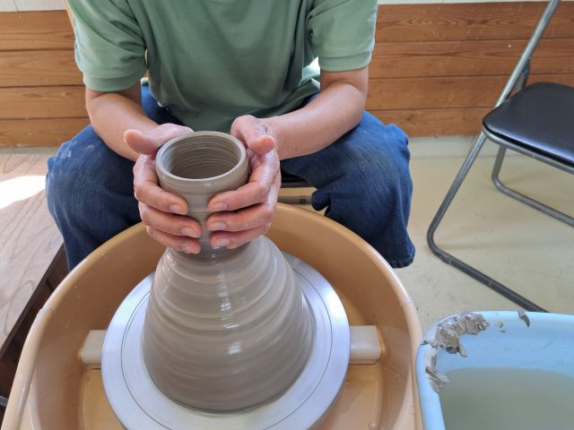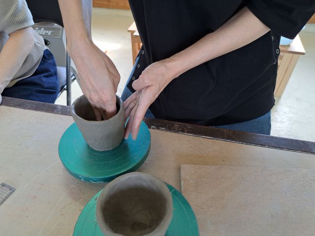 手回しろくろを使い、粘土で作った紐を積見重ねたり、板状に伸ばした粘土を組み合わせて形を作ったり、土の塊に穴をあけたりしなから、